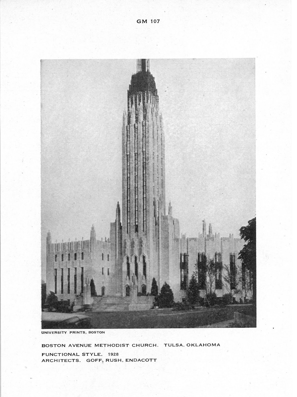 The Boston Avenue United Methodist Church, located in downtown Tulsa, Oklahomaand completed in 1929, is considered to be one of the finest examples of ecclesiasticalArt Deco architecture in the United States, and has been placed on the National Register of Historic Places. Built by a congregation of the Methodist Episcopal Church, South, it was designated a National Historic Landmark in 1999